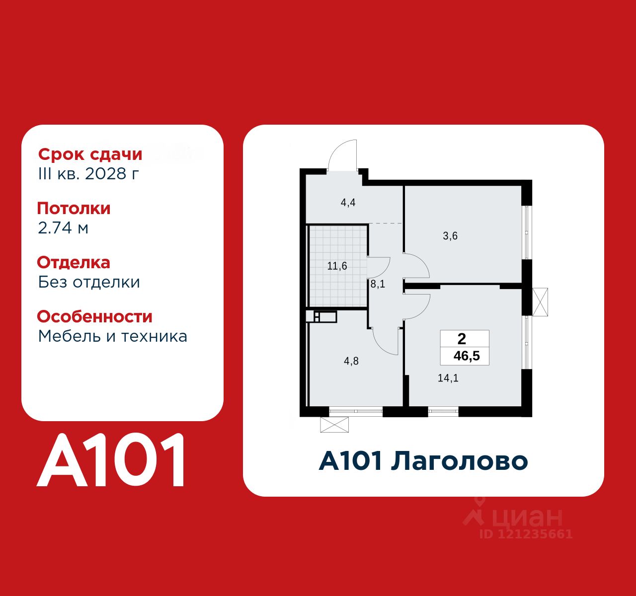 2-комнатная квартира площадью 46.45 в ЖК "А101 Лаголово" на 9 этаже. Квартира без отделки. Вид из окна на улицу. В квартире 1 санузел. Высота потолков 2.74 м. Ключи в 2025 году.
