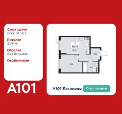 Старт продаж! 1-комнатная квартира площадью 35.37 в ЖК "А101 Лаголово" на 8 этаже. Квартира без отделки. Вид из окна на улицу. В квартире 1 санузел. Высота потолков 2.74 м.
