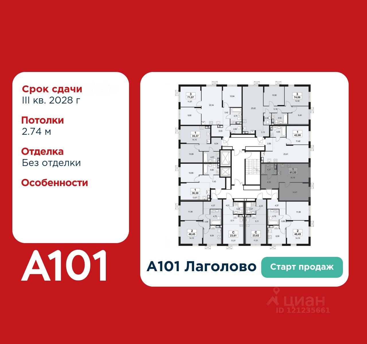 Старт продаж! 1-комнатная квартира площадью 41.35 в ЖК "А101 Лаголово" на 8 этаже. Квартира без отделки. Вид из окна на улицу. В квартире 1 санузел. Высота потолков 2.74 м.