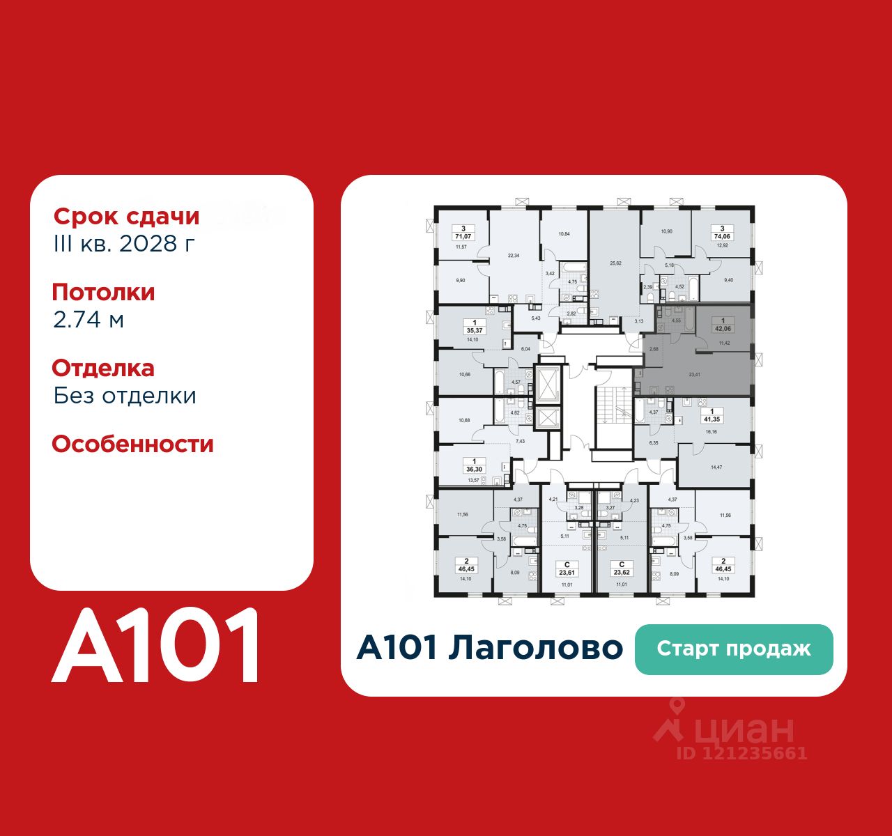 Старт продаж! 1-комнатная квартира площадью 42.06 в ЖК "А101 Лаголово" на 8 этаже. Квартира без отделки. Вид из окна на улицу. В квартире 1 санузел. Высота потолков 2.74 м.