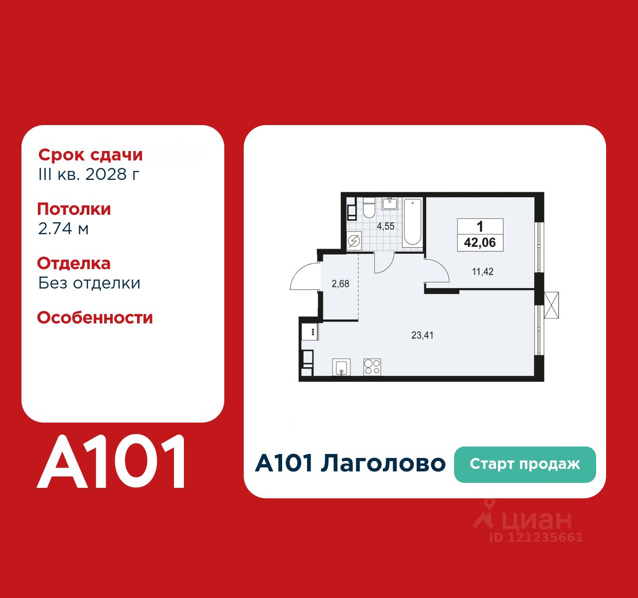Старт продаж! 1-комнатная квартира площадью 42.06 в ЖК "А101 Лаголово" на 7 этаже. Квартира без отделки. Вид из окна на улицу. В квартире 1 санузел. Высота потолков 2.74 м. Предложения от застройщика на ноябрь 2025: - Гибкая рассрочка 20 000 руб/мес. и первым взносом 10%. ОТДЕЛКА Квартира передается без отделки. Благодаря тому, что в данном типе отделки стены не возводятся, вы сможете создать удобную планировку и самостоятельно организовать зонирование комнат. ПАРАДНАЯ. В каждой парадной предусмотрены места для хранения велосипедов и колясок, гостевой санузел и удобная зона ожидания для гостей. ДВОРЫ И ОКРУЖЕНИЕ. Просторные дворы безопасны для детей, так как свободны от машин, закрыты от посторонних и постоянно находятся под видеонаблюдением. Во дворах создается разнообразная среда для детей всех возрастов: детские площадки с батутами, тактильными дорожками и игровыми комплексами. Для активного отдыха - воркаут-площадки, столы для пинг-понга и газоны для занятий йогой. Во дворах есть и тихие уголки - зеленые гостиные с уличной мебелью, где можно поработать на свежем воздухе или отдохнуть в тишине. Из внутренних дворов комплекса можно выйти на пешеходный бульвар длиной около 900 метров. Здесь будет организовано полноценное общественное пространство с амфитеатром, уличным кафе, ручьем, фонтаном и множеством мест для отдыха и игр. Большую часть бульвара займут благоустроенные зеленые зоны и теневые сады из десятков видов деревьев и кустарников, многолетних цветов и трав, которые будут радовать глаз круглый год. "А101 Лаголово" - современный город у подножия знаменитых Дудерговских высот, в объятиях чистейших озер и зеленых живописных массивов, наполненный всем необходимым для счастливой жизни. ИНФРАСТРУКТУРА. Мы занимаемся комплексным освоением территории. Наш приоритет - доступность всех сервисов для счастливой жизни. 1. Лаголово-город 15-ти минутной доступности. Вся необходимая инфраструктура: магазины, салоны красоты, образовательные учреждения, медицинские центры находятся в 15-ти минутах пешей прогулки от любой точки жилого комплекса. Это позволяет не тратить время на долгие перемещения. 2. Представьте идеальный город, где ребенок может спокойно играть, а пожилой человек наслаждаться заслуженным отдыхом. Жилая среда нашего комплекса может комфортно использоваться как 8-летним ребенком, так и 80-летним пожилым человеком. Дома, улицы, общественные пространства, тротуары спроектированы с заботой о людях разных возрастов. 3. Мы активно развиваем авторскую образовательную экосистему "Лёрнити". Она включает строительство 8 современных детских садов (2000 мест) и 3 школ (2945 учащихся). Мы учим родителей гармонично общаться с детьми, помогаем малышам подготовиться к школе, а подросткам - выбрать будущую профессию и развить таланты. Не хватает средств на покупку кладового помещения? Оформите ипотеку на квартиру и добавьте к ней часть стоимости кладовой. ЗАСТРОЙЩИК ГК "А101" - крупный инвестиционно-строительный холдинг, занимает 6-е место