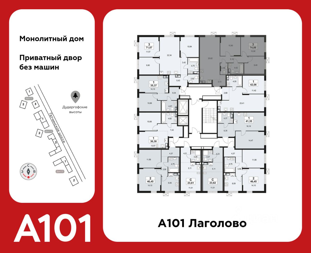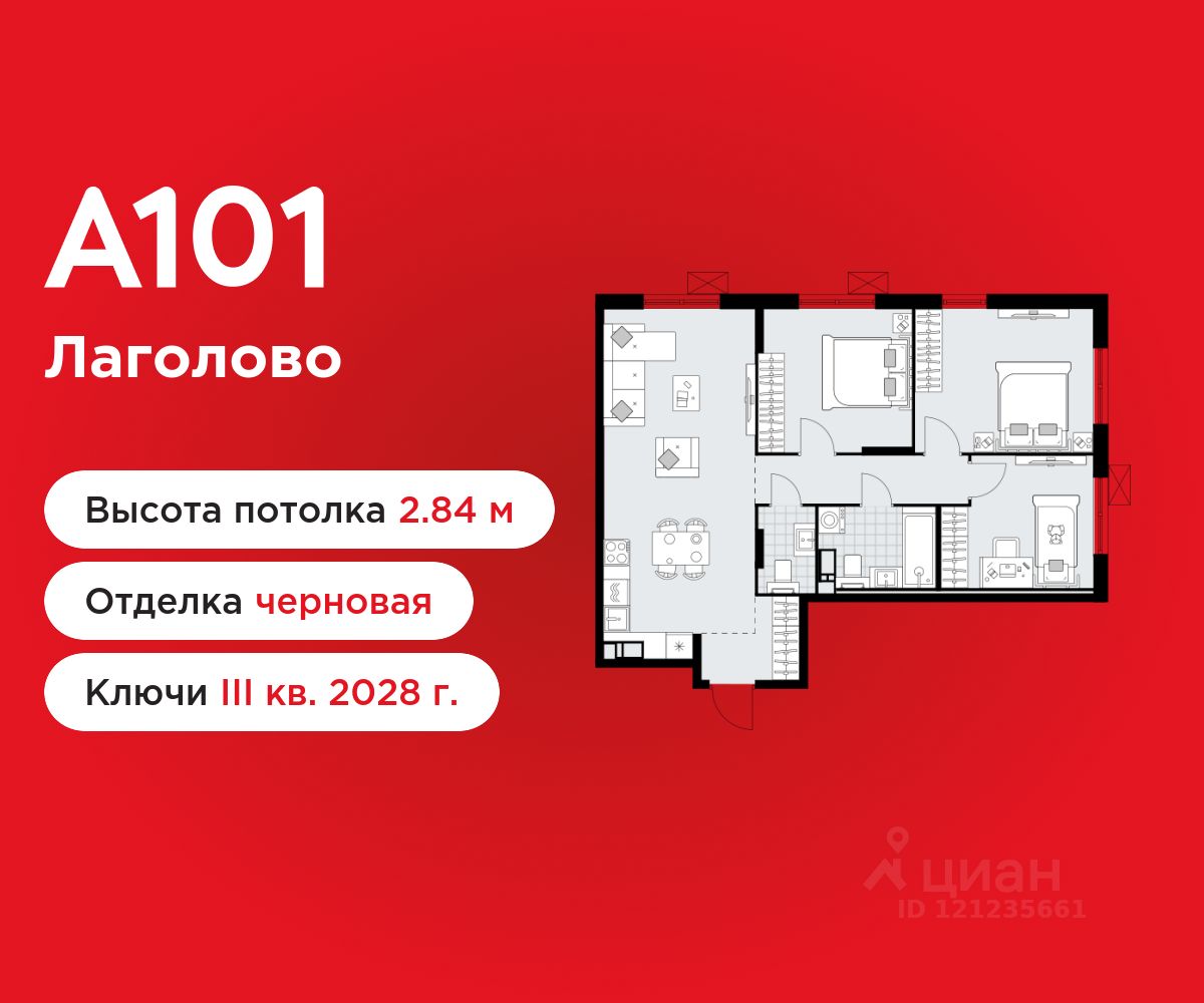 3-комнатная квартира площадью 74.06 в ЖК "А101 Лаголово" на 7 этаже. Квартира без отделки. Вид из окна на улицу. В квартире 2 санузла. Высота потолков 2.84 м.