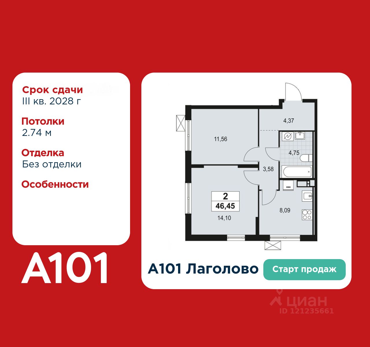 Старт продаж! 2-комнатная квартира площадью 46.45 в ЖК "А101 Лаголово" на 6 этаже. Квартира без отделки. Вид из окна на улицу. В квартире 1 санузел. Высота потолков 2.74 м.