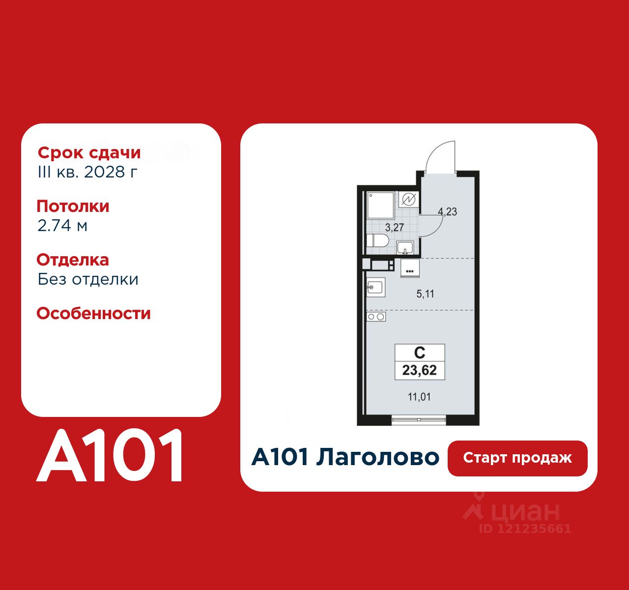 Старт продаж! Студия площадью 23.62 в ЖК "А101 Лаголово"  на 3 этаже. Квартира без отделки. Вид из окна на улицу. В квартире 1 санузел. Высота потолков 2.74 м.