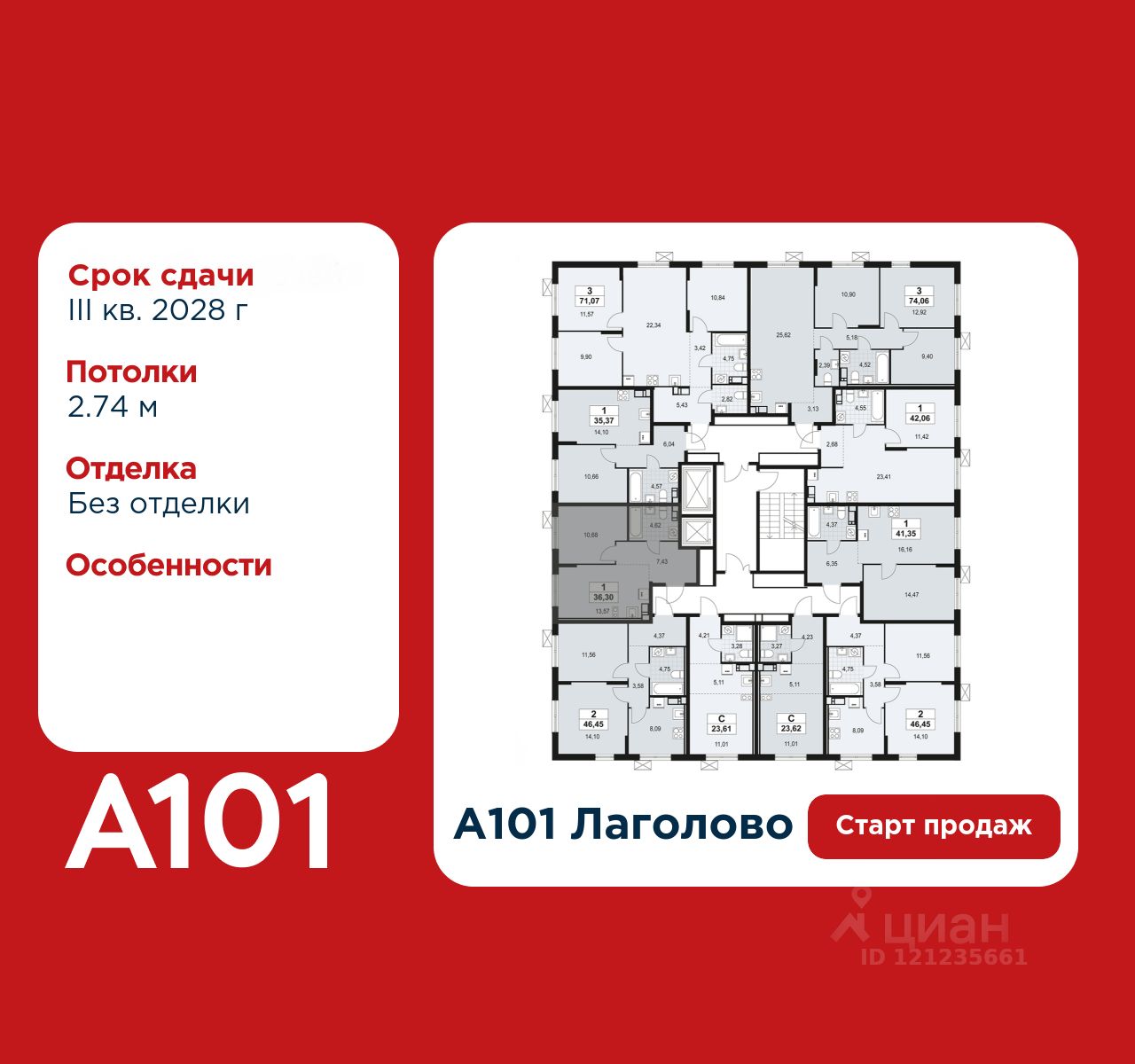 Старт продаж! 1-комнатная квартира площадью 36.30 в ЖК "А101 Лаголово" на 3 этаже. Квартира без отделки. Вид из окна на улицу. В квартире 1 санузел. Высота потолков 2.74 м.
