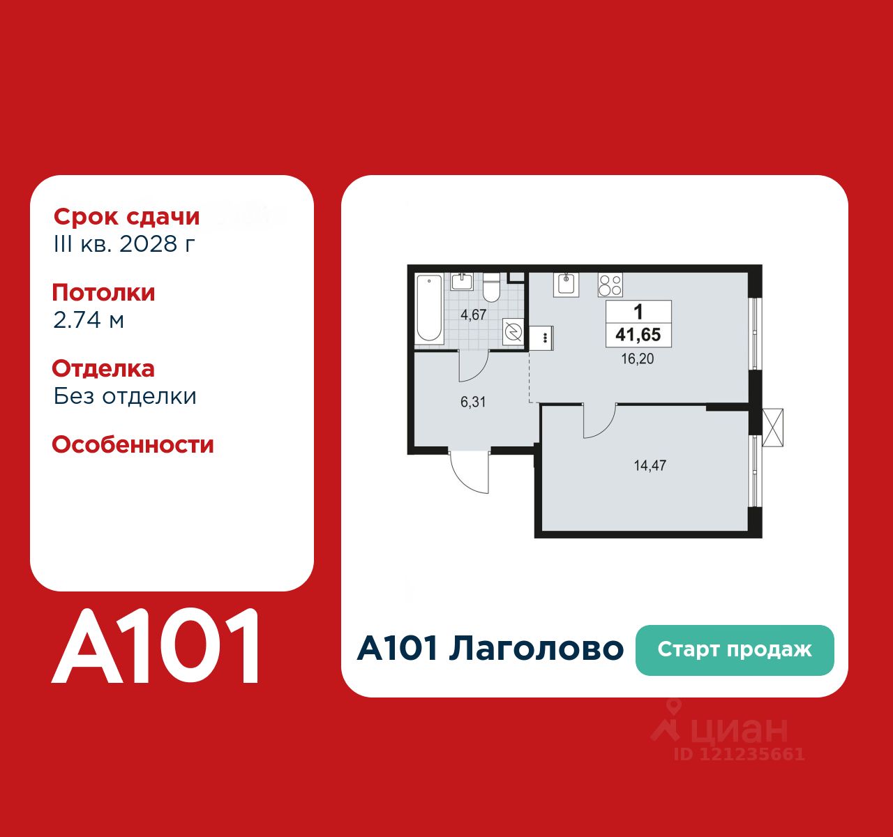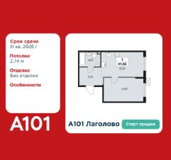 Старт продаж! 1-комнатная квартира площадью 41.65 в ЖК "А101 Лаголово" на 2 этаже. Квартира без отделки. Вид из окна во двор. В квартире 1 санузел. Высота потолков 2.74 м.