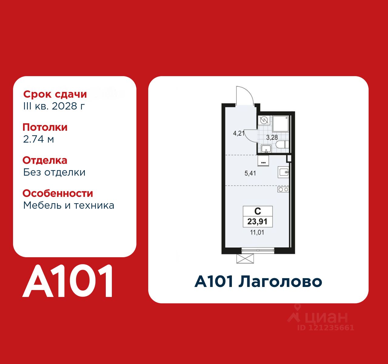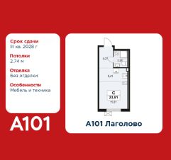 Студия площадью 23.91 в ЖК "А101 Лаголово" на 2 этаже. Квартира без отделки. Вид из окна во двор. В квартире 1 санузел. Высота потолков 2.74 м. Ключи в 2025 году.