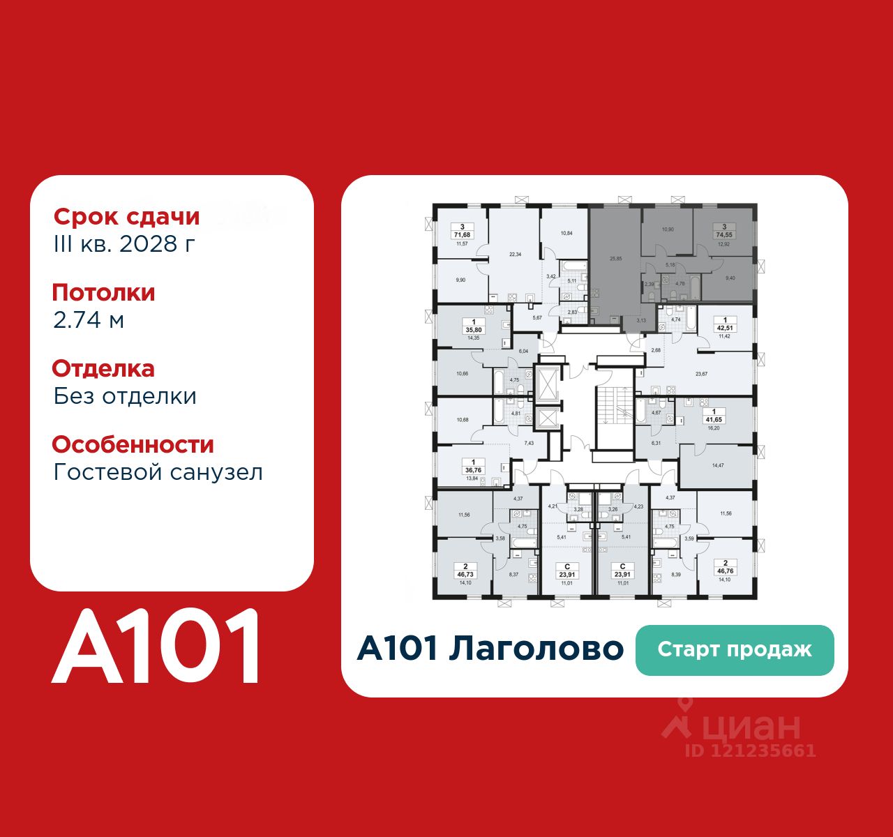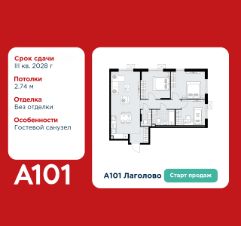Старт продаж! 3-комнатная квартира площадью 74.55 в ЖК "А101 Лаголово" на 2 этаже. Квартира без отделки. Вид из окна во двор. В квартире 2 санузла. Высота потолков 2.74 м.