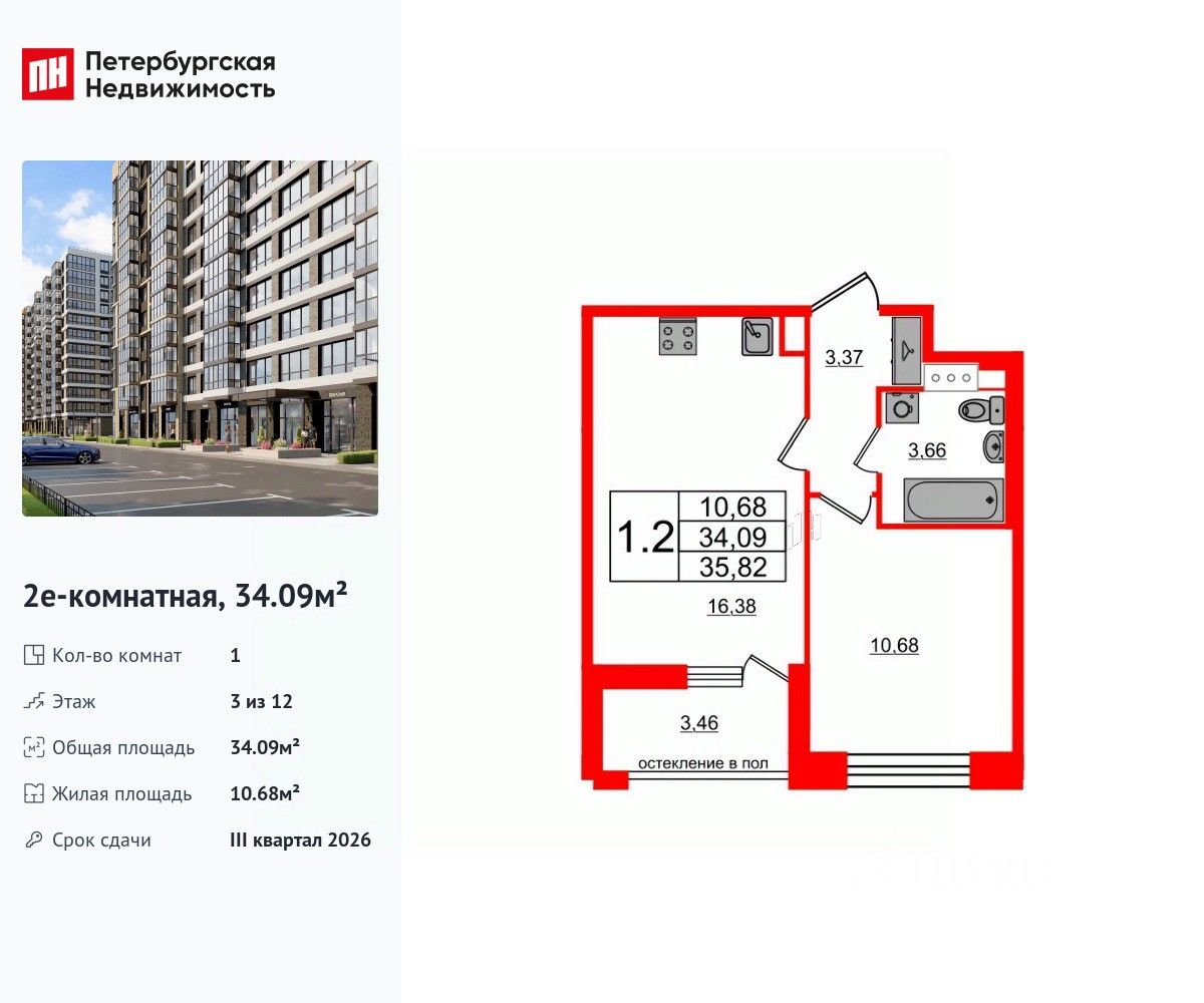 Удобная, классическая, функциональная европланировка, большая кухня-гостиная 16.38 м², вместительная прихожая 3.37 м². Общая площадь квартиры - 34.09 м², жилая 10.68 м², высота потолка 2.77 м.