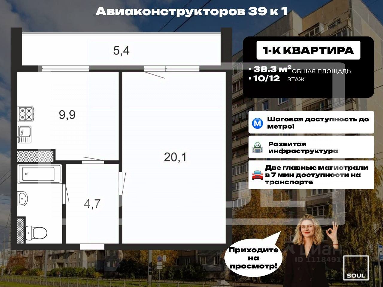 Арт. 123039126 Продается просторная однокомнатная квартира в пешей доступности от метро!