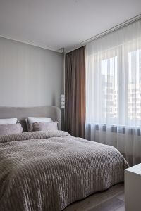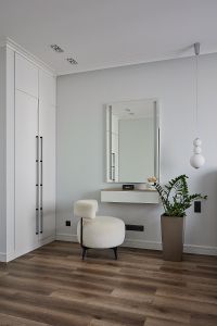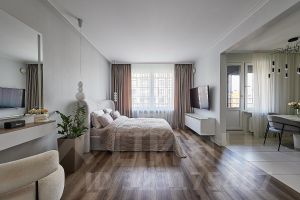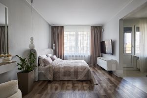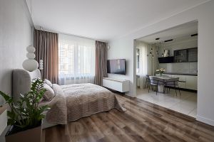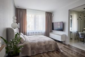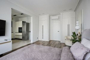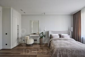 Отдельная спальня — это место, где можно полностью расслабиться и забыть о суете. Функционал спальни полностью продуман, где есть ТВ зона, зона хранения, будуарная зона, что добавляет эстетики квартире.