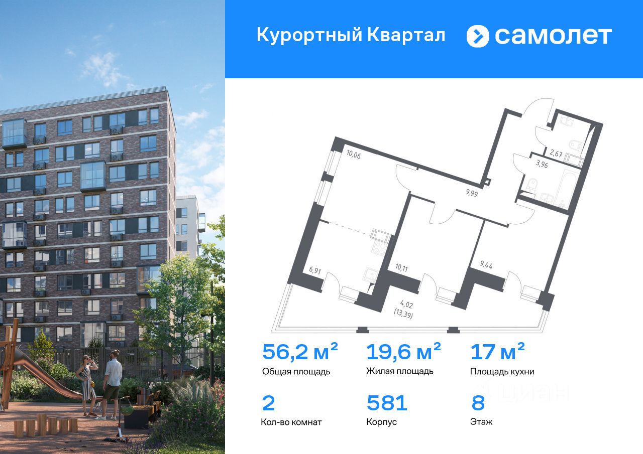 Строим кварталы для жизни с заботой о будущем. Предлагается 2-комнатная квартира комфорт-класса 56,2 кв.м в корпусе 581 на 8 этаже, в ЖК "Курортный Квартал"