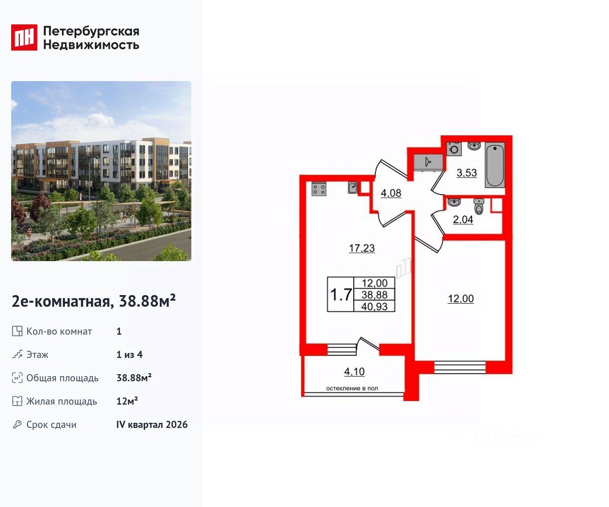Удобная, классическая, функциональная европланировка, большая кухня-гостиная 17.23 м², просторная прихожая 4.08 м². Общая площадь квартиры - 38.88 м², жилая 12 м², высота потолка 2.77 м.