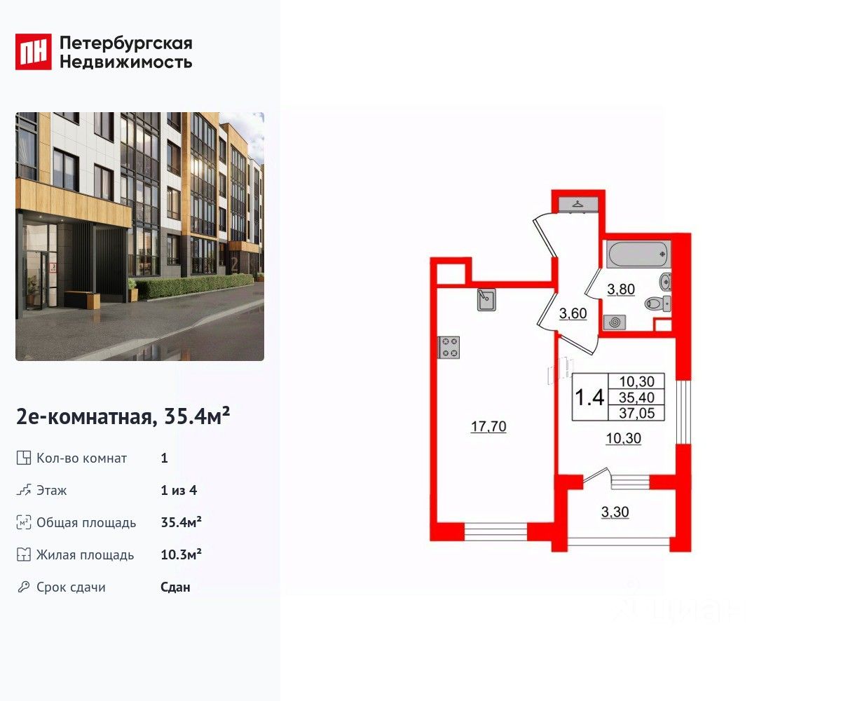 Удобная, классическая, функциональная европланировка, большая кухня-гостиная 17.7 м², вместительная прихожая 3.6 м². Общая площадь квартиры - 35.4 м², жилая 10.3 м², высота потолка 2.76 м.
