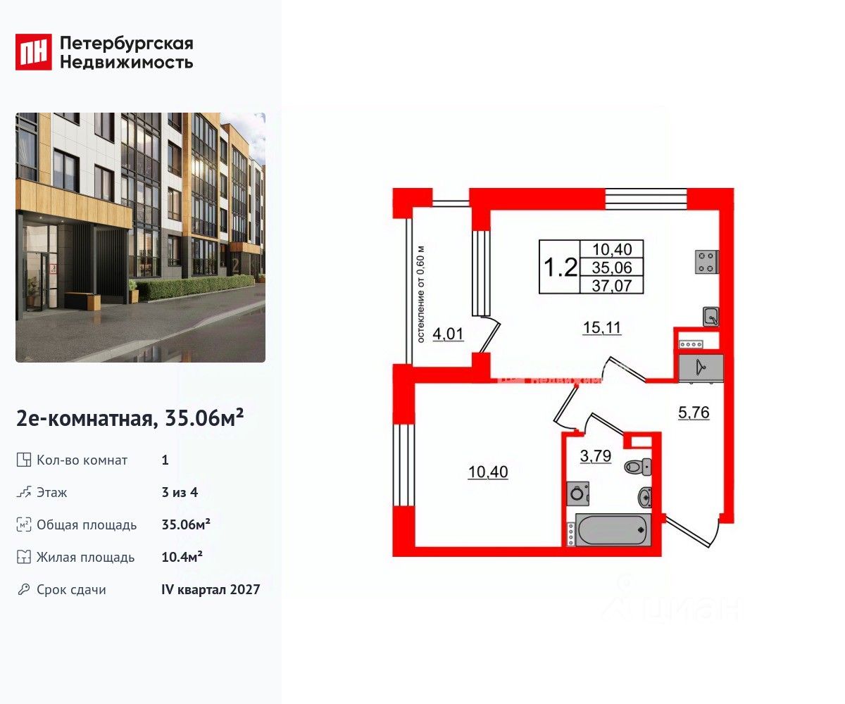 Удобная, классическая, функциональная европланировка, большая кухня-гостиная 15.11 м², просторная прихожая 5.76 м². Общая площадь квартиры - 35.06 м², жилая 10.4 м², высота потолка 2.77 м.