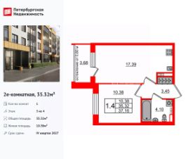 Удобная, классическая, функциональная европланировка, большая кухня-гостиная 17.39 м², вместительная прихожая 3.45 м². Общая площадь квартиры - 35.32 м², жилая  10.38 м², высота потолка 2.77 м.