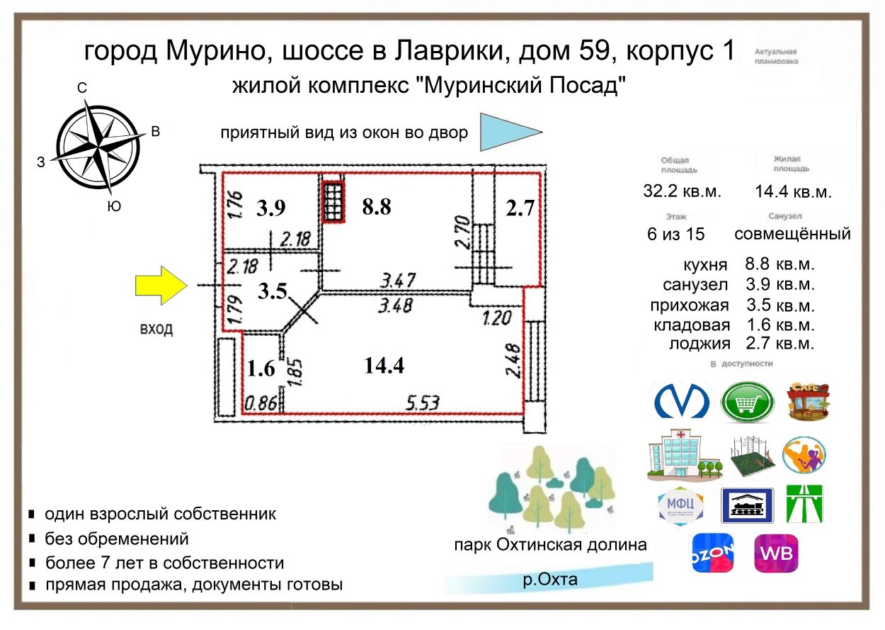 В прямой продаже однокомнатная квартира с удобной планировкой в современном жилом комплексе "Муринский Посад ", расположенном в доступности от метро Девяткино!