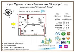 - площадь 32.2 кв.м. без учета лоджии (27.16 кв.м. с лоджией);