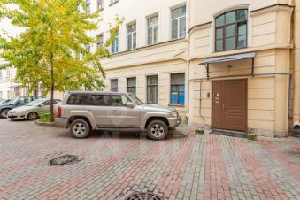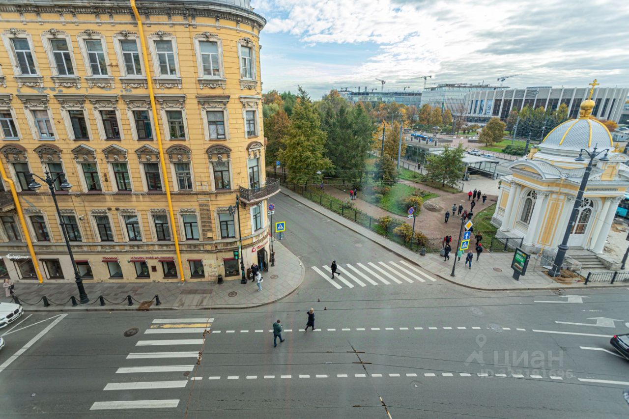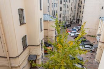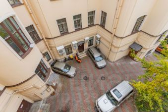 Три входа в квартиру (два с парадной лестницы, один с черной). Шесть окон на Большой проспект и проспект Добролюбова с видом на ДС Юбилейный, Судебный квартал и часовню Алексндра Невского. Пять окон в тихий двор (не колодец).