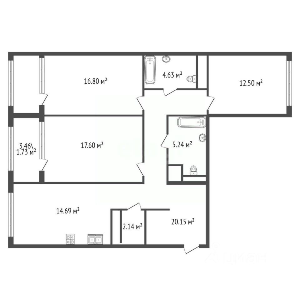 - Площадь: 96.21 м² - Площадь кухни: 14.69 м²