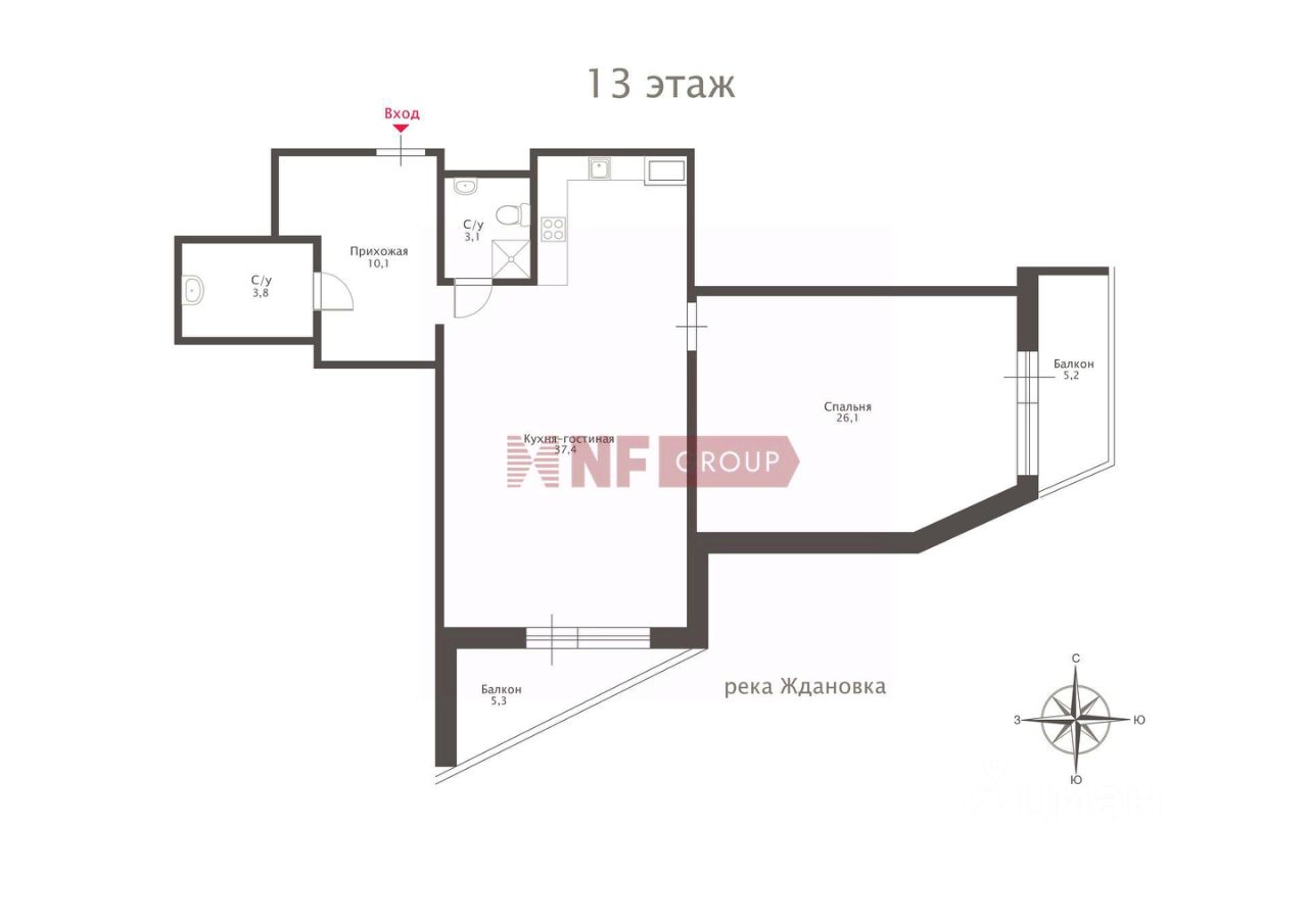 Планировка включает в себя: кухню-гостиную площадью 37,4 кв. м, спальню и два балкона.