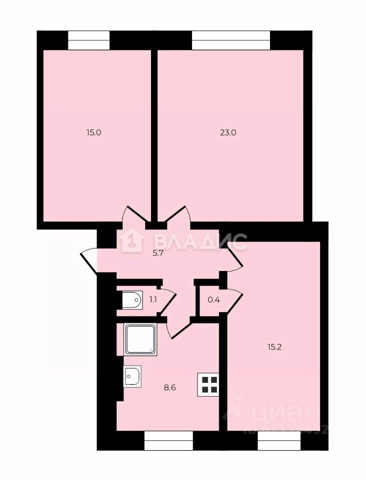 Планировка: Три изолированные комнаты. В самой большой комнате (23 м²) установлена перегородка, что позволяет использовать пространство как гостиную и отдельную спальню (смотрите фото).