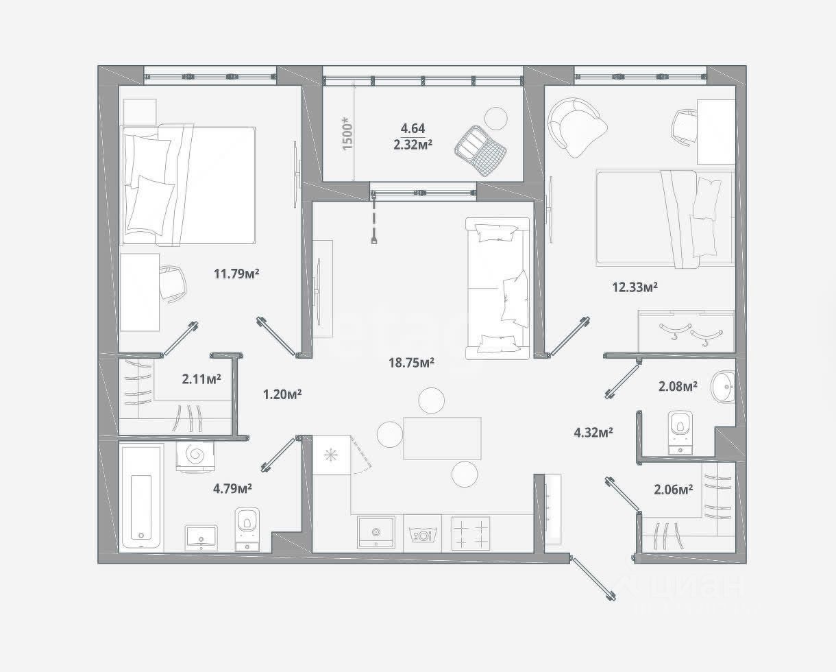 Квартира оснащена системой "Умный дом", позволяющей удаленно управлять освещением, климатом и безопасностью, что повышает комфорт и оптимизирует энергозатраты. Планировка площадью 61,75 кв.м продумана для функционального зонирования и комфортного проживания.