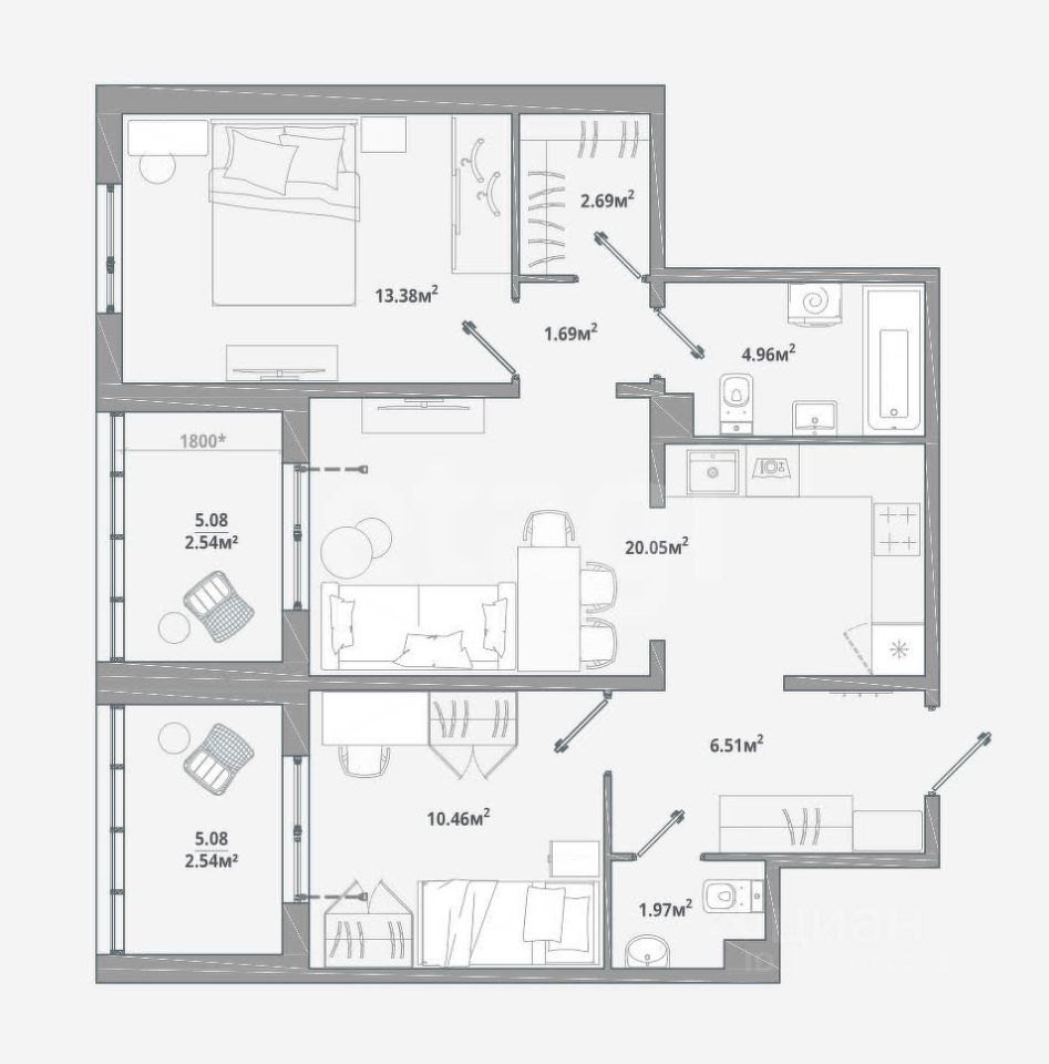 Придомовое пространство организовано как арт-зона с закрытыми от транспорта дворами, создающими безопасную среду для отдыха. Квартира оснащена системой "Умный дом" для удаленного управления освещением, климатом и безопасностью, что оптимизирует энергопотребление и повышает уровень комфорта. Продуманная планировка площадью 66,79 кв.м позволяет эффективно зонировать пространство для комфортного проживания семьи.