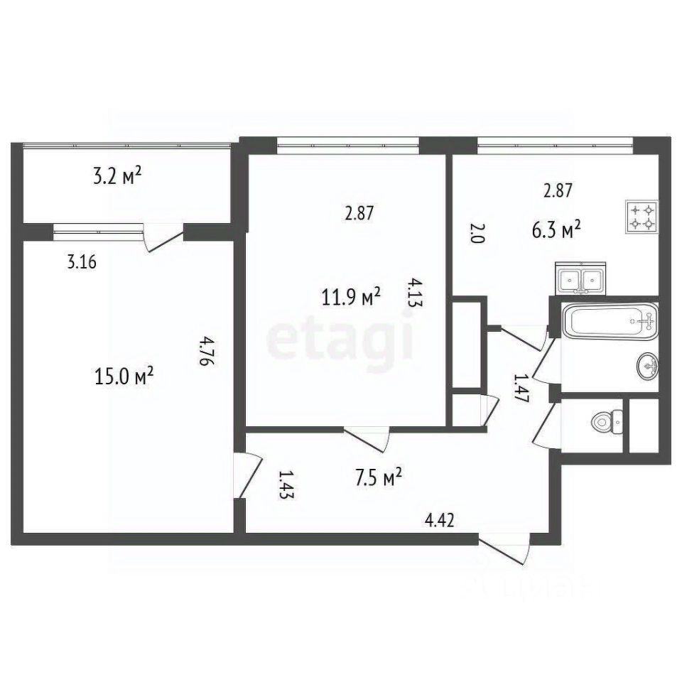 В продаже двухкомнатная квартира площадью 44 кв. м расположена в пешей доступности от станции метро Юго-западная