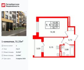 Удобная, классическая планировка, кухня 9.15 м², вместительная прихожая 3.73 м². Общая площадь квартиры - 31.25 м², жилая 14.49 м², высота потолка 3.07 м.