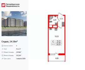 Удобная, классическая, функциональная европланировка, вместительная прихожая 3.1 м². Общая площадь студии - 24.58 м², жилая 18.23 м², высота потолка 2.77 м.