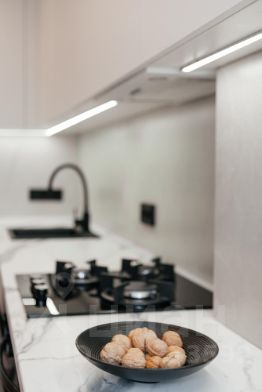 Кухня укомплектована встроенной техникой (духовой шкаф, 3-х конфорочная варочная панель, посудомоечная машина, вытяжка). Удобный раздвижной стол для обедов и вечерних посиделок с друзьями.