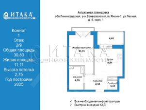 120975757 Твоя уютная квартира — готова к жизни прямо сейчас! Идеальный вариант для тех, кто ценит комфорт, стиль и практичность!Однокомнатная квартира площадью 30,83 кв.м. на 2 этаже современного дома — это пространство, где всё продумано до мелочей.Кухня 9,94 кв.м. — место, где рождаются вкусные завтраки и душевные вечера.Выход на лоджию 4,44 кв.м. — идеальная зона для кофе, вдохновения и свежего воздуха.Комната 11,11 кв.м. с французским балконом — светлая, уютная и очень атмосферная.Санузел 4,26 кв.м. — правильной формы, легко разместит всю необходимую мебель.Прихожая 5,52 кв.м. и отдельная гардеробная 1,14 кв.м. — порядок и комфорт с первых шагов.В квартире выполнен качественный ремонт — ничего не нужно доделывать.Просто заезжай и живи — всё готово к твоей новой истории!Удобное расположение, современный дом, чистые дворы и европейская атмосфера — отличное место для старта самостоятельной жизни или уютного гнёздышка для двоих.Твоя новая жизнь начинается здесь!В доме, где уют начинается с порога!Добро пожаловать в современный квартал европейского уровня — всего в 25 минутах от метро Ладожская или пр. Большевиков.Это место, где хочется жить, растить детей, встречать закаты на балконе и радоваться каждому дню.Тихий и безопасный квартал для семьиЗдесь нет машин во дворах — дети могут спокойно играть, кататься на велосипедах и гулять с друзьями.Зелёные аллеи, уютные зоны отдыха, яркие детские площадки — всё вокруг создано с заботой и любовью к людям.Атмосфера уюта и красотыКвартал спроектирован вместе с голландским архитектором — дома средней этажности, тёплые цвета фасадов и ощущение европейского уюта.Здесь приятно просто гулять — чисто, светло и по-домашнему спокойно.Всё нужное для семьи — рядомШкола и три детских сада прямо в квартале — путь ребёнка видно из окна, и не нужно переходить дороги.На первых этажах — магазины, кафе, аптеки, салоны красоты, всё рядом, как в хорошем европейском городке.Для тех, кто любит движение и жизньВо дворе — площадки для футбола, баскетбола, скейт-парк, зоны воркаута и велодорожки.А для взрослых — фитнес-центр с бассейном (Фитнес Хаус), где можно поддерживать форму и отдыхать после рабочего дня.Удобное расположениеДо КАД — всего 2 км.До Петербурга — всего 25 минут на машине.Этот квартал — не просто место на карте. Это пространство, где легко быть собой, где дети растут в безопасности, а каждый день начинается с чувства дома.Если вы мечтали о уютной квартире рядом с городом, но с атмосферой загородного покоя — вы нашли идеальное место. Итака. 30 лет на рынке.