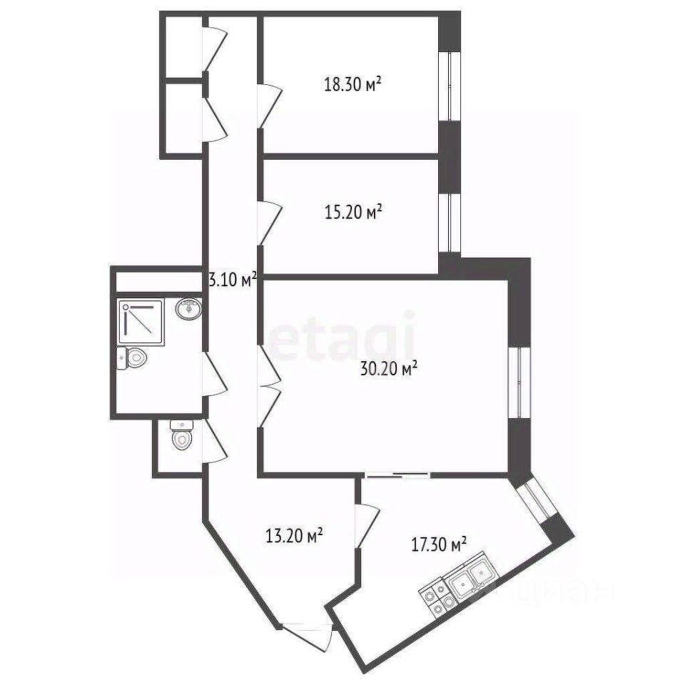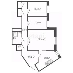Планировка функциональна и комфортна: большой зал 30.2 м² можно объединить с кухней 17.3 м² , формируя светлое пространство около 50 м² для жизни и приема гостей, а две изолированные спальни 15.2 и 18.3 метра , одна из которых с гардеробной, обеспечивают уединение. Два санузла и дополнительная зона хранения дополняют картину идеального семейного гнезда.