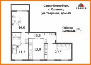 Дом расположен по адресу: Колпино, улица Тверская, д. 45. Квартира расположена на 6 этаже. Общая площадь- 80,1 кв.м. Комнаты - 20,5+16+11,5 , кухня - 15 кв.м. Есть застекленная лоджия. Вид из окна: во двор. Дом находится во дворе, в непосредственной близости детский сад, школа, детская поликлиника, художественная школа, остановки общественного транспорта и магазины.
