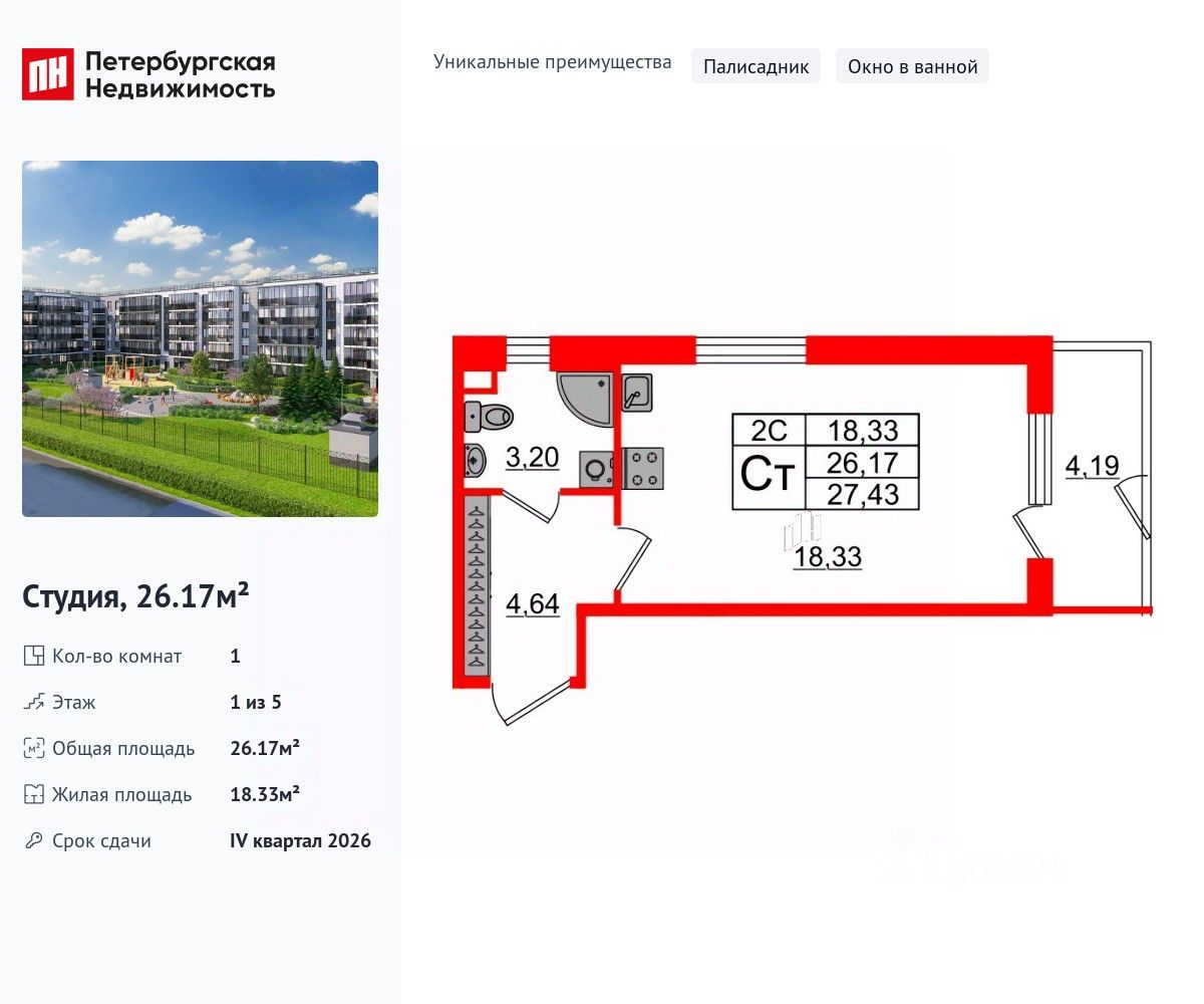Уникальная, функциональная европланировка, просторная прихожая 4.64 м². Общая площадь студии - 26.17 м², жилая 18.33 м², высота потолка 2.77 м.