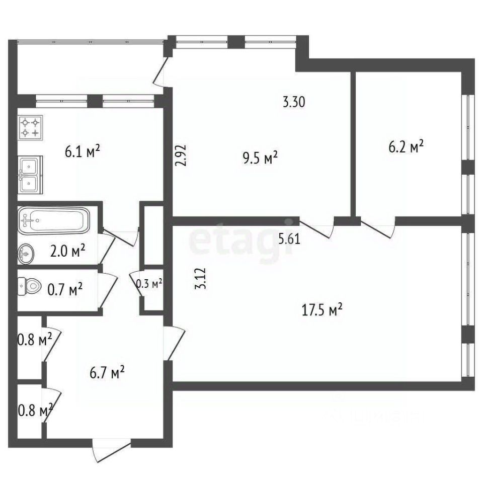 Трехкомнатная квартира 50,6 кв.м с ОГРОМНОЙ гостиной (17,5 кв.м), и двумя жилыми комнатами (9,5 кв.м, 6.2 кв.м), из одной есть выход на застекленный балкон, окна выходят во двор. В квартире выполнен свежий, качественный ремонт. Сантехника и электрика вся поменяна. Мебель остается по договоренности с собственником.