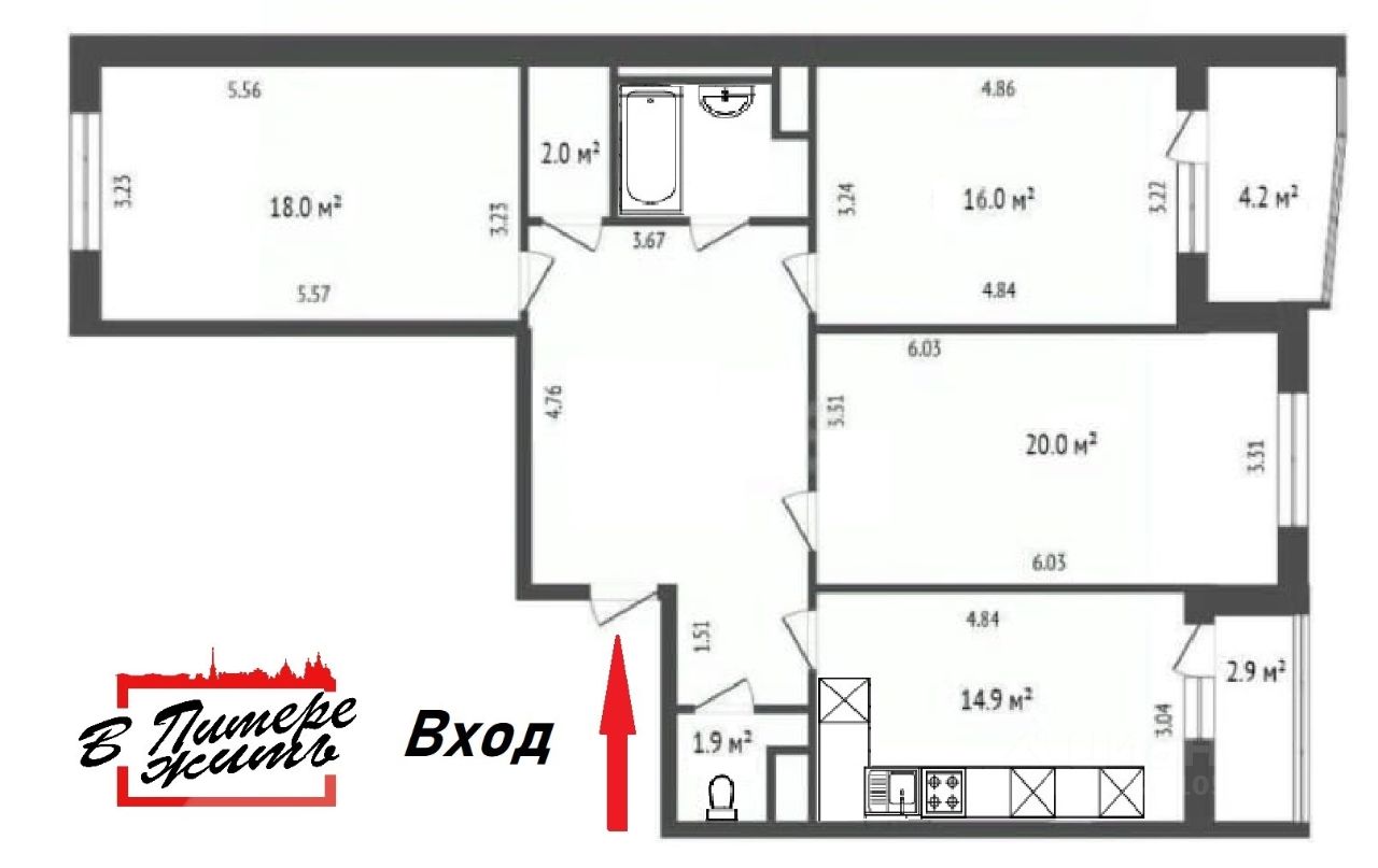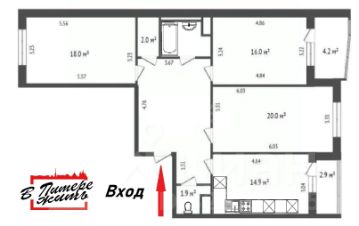 Жилая площадь квартиры-54,0 кв.м. Площадь комнат 20, 18 и 16 кв.м.