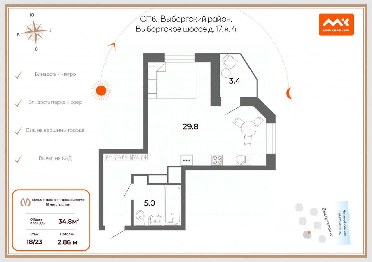 Арт. 123042893 Динамичный и благоустроенный район между станциями метро "Озерки" и "Проспект Просвещения". Район отличается развитой инфраструктурой: в пешей доступности находятся торговые центры, кафе, школы, фитнес-клубы, аптеки и зелёные зоны для прогулок.