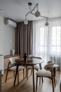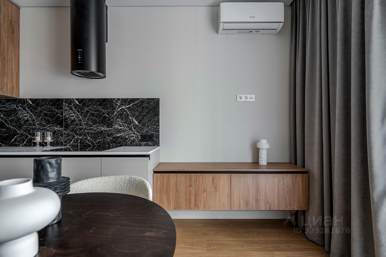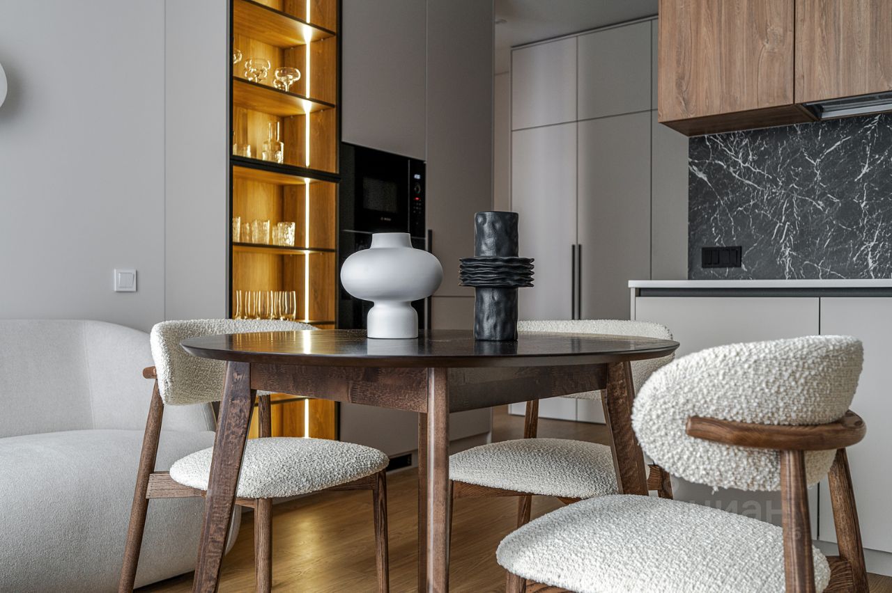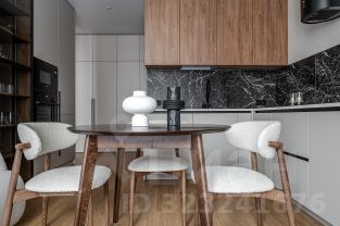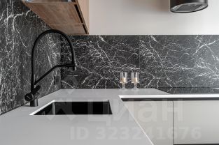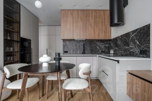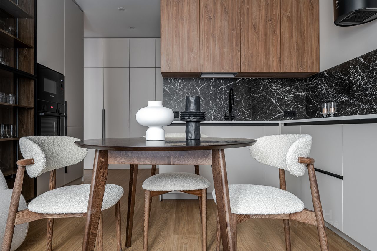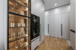 Техника: индукционная панель Bosch, встроенный холодильник, микроволновка Bosch, духовка Bosch, вытяжка, посудомоечная машина Bosch.