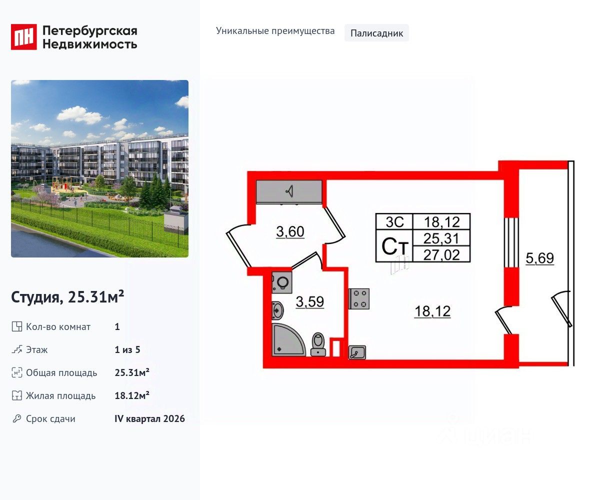 Уникальная, функциональная европланировка, просторная прихожая 3.6 м². Общая площадь студии - 25.31 м², жилая 18.12 м², высота потолка 2.77 м.