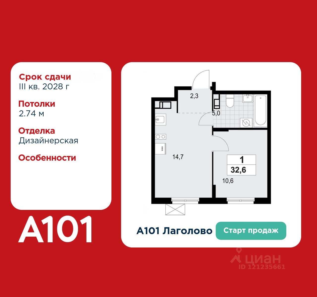 Старт продаж! 1-комнатная квартира площадью 32.65 в ЖК "А101 Лаголово" на 3 этаже. Квартира с отделкой. Вид из окна во двор. В квартире 1 санузел. Высота потолков 2.74 м.