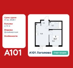 Старт продаж! 1-комнатная квартира площадью 33.10 в ЖК "А101 Лаголово" на 2 этаже. Квартира с отделкой. Вид из окна во двор. В квартире 1 санузел. Высота потолков 2.74 м.