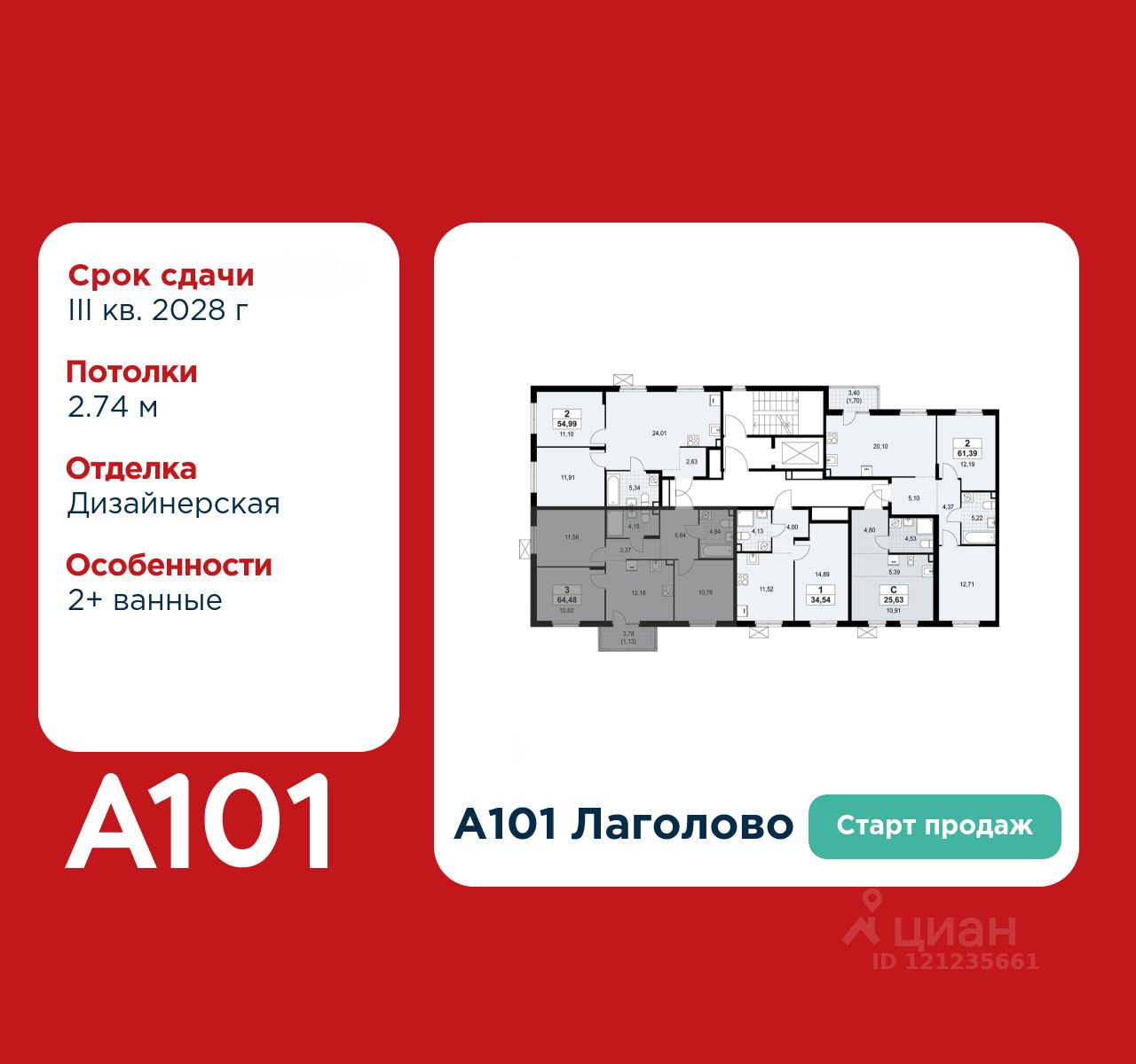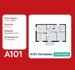 Старт продаж! 3-комнатная квартира площадью 64.48 в ЖК "А101 Лаголово" c балконом на 2 этаже. Квартира с отделкой. Вид из окна во двор. В квартире 2 санузла. Высота потолков 2.74 м.