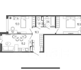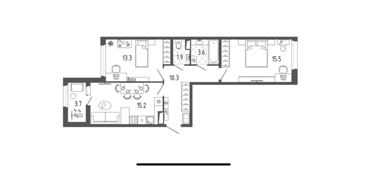Двусторонняя, просторная и удобная для жизни квартира с двумя спальнями  отличный выбор для семьи с ребёнком. • Удобный холл-прихожая с местом для размещения гардеробной или шкафа-купе. Входная зона не является проходной. • Вблизи входной зоны расположен вход в кухню-гостиную, пространство которой разделяется на зону готовки, столовую и зону отдыха. • Кухня-гостиная имеет выход на широкую лоджию, на которой можно оборудовать дополнительное место для отдыха или работы.  • Жилые комнаты максимально удалены от шумной входной зоны. В меньшей комнате можно обустроить уютную спальню для ребёнка. Другая комната отлично подойдёт для родителей.  • Площадь раздельного санузла с просторной ванной комнатой позволит разместить всю необходимую сантехнику, мебель, стиральную машину.