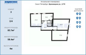 Жилая площадь - 58.4 кв.м ( 21+17+20.4)
