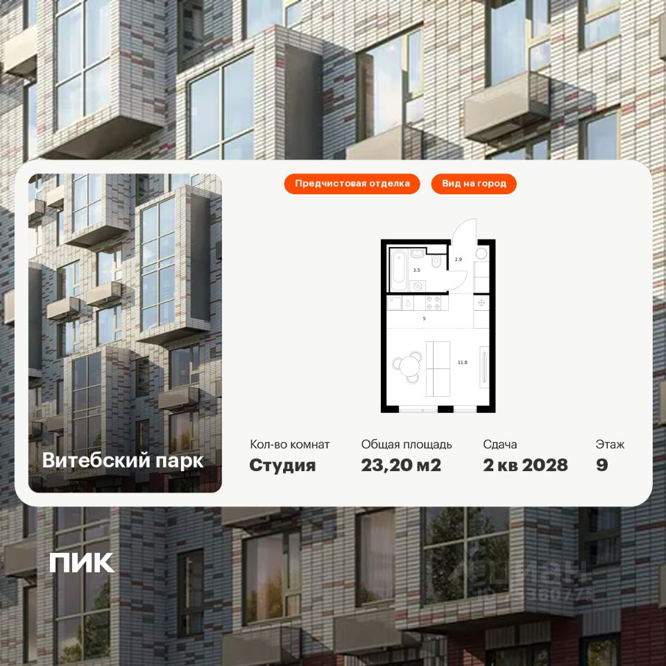 Продаётся квартира-студия площадью 23,2 кв.м на 9 этаже 12 этажного дома (Корпус 6, Секция 1) проекта ПИК Витебский парк. Светлый просторный подъезд на уровне земли, функциональная планировка, большие окна, предчистовая отделка.
