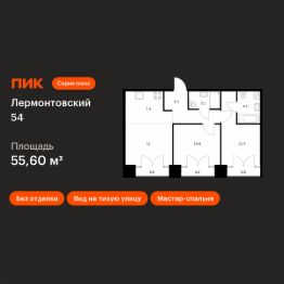 Продаётся 2-комн. квартира площадью 55,6 кв.м на 8 этаже 9 этажного дома (Корпус 2.1, Секция 2) проекта ПИК Лермонтовский 54. Светлый просторный подъезд на уровне земли, функциональная планировка, большие окна, без отделки.