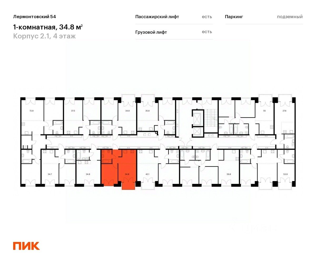 Продаётся 1-комн. квартира площадью 34,8 кв.м на 4 этаже 9 этажного дома (Корпус 2.1, Секция 6) проекта ПИК Лермонтовский 54. Светлый просторный подъезд на уровне земли, функциональная планировка, большие окна, без отделки.
