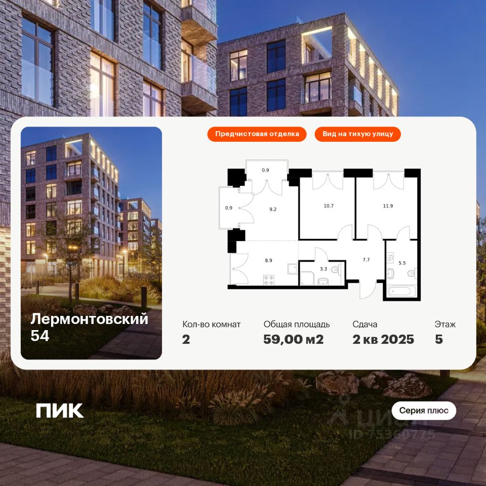Продаётся 2-комн. квартира площадью 59 кв.м на 5 этаже 7 этажного дома (Корпус 1, Секция 1) проекта ПИК Лермонтовский 54. Светлый просторный подъезд на уровне земли, функциональная планировка, большие окна, предчистовая отделка.